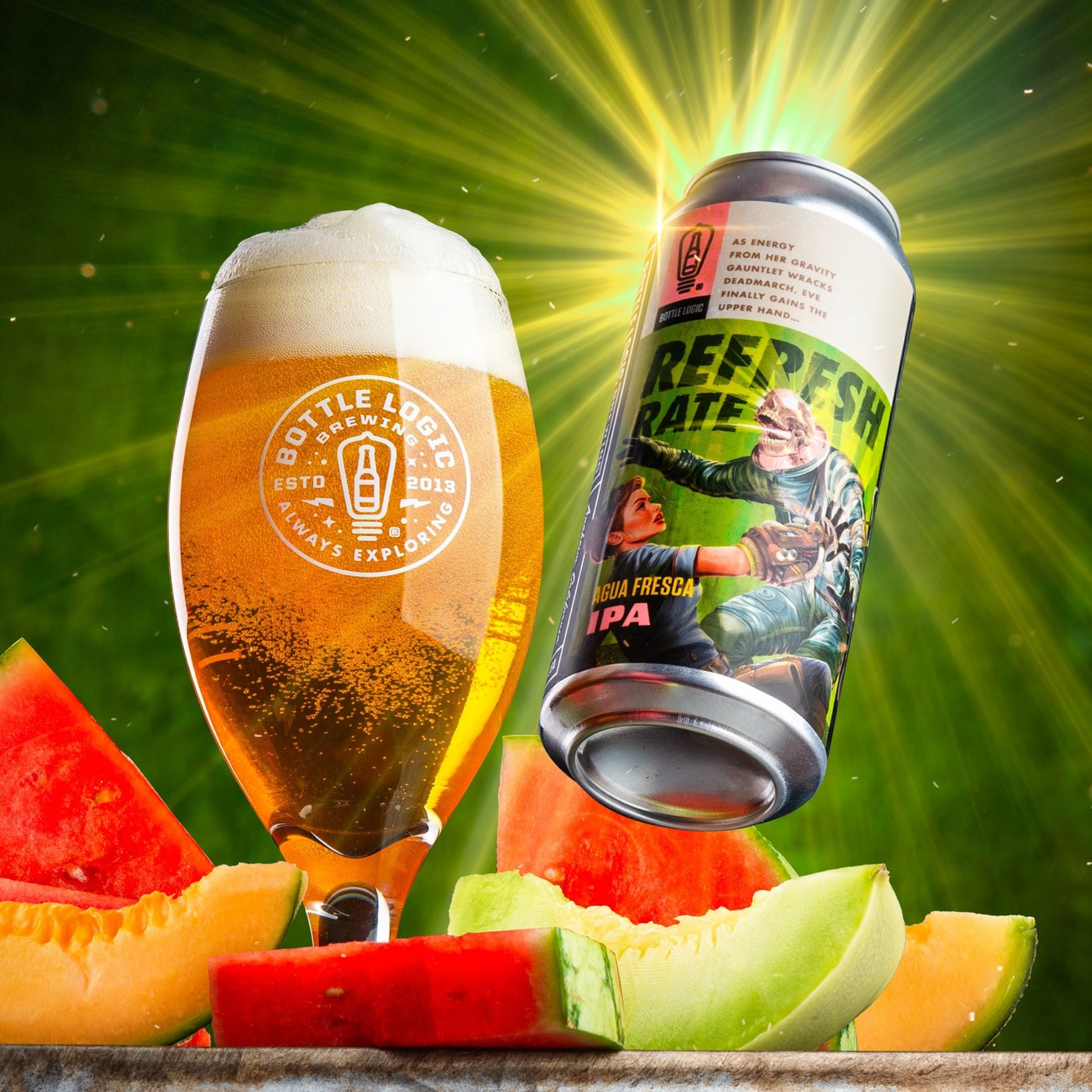 Description: As energy from her Gravity Gauntlet wracks Deadmarch, Eve finally gains the upper hand in... Refresh Rate, a West Coast IPA conditioned with cantaloupe, honeydew, and watermelon!